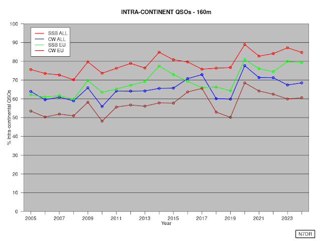 Flogging a dead horse as I do every year, on 160m 60% of QSOs in this "world wide DX" contest were between two European entrants, even in the more DX-friendly mode. On SSB, about four fifths of all QSOs were between two European entrants.